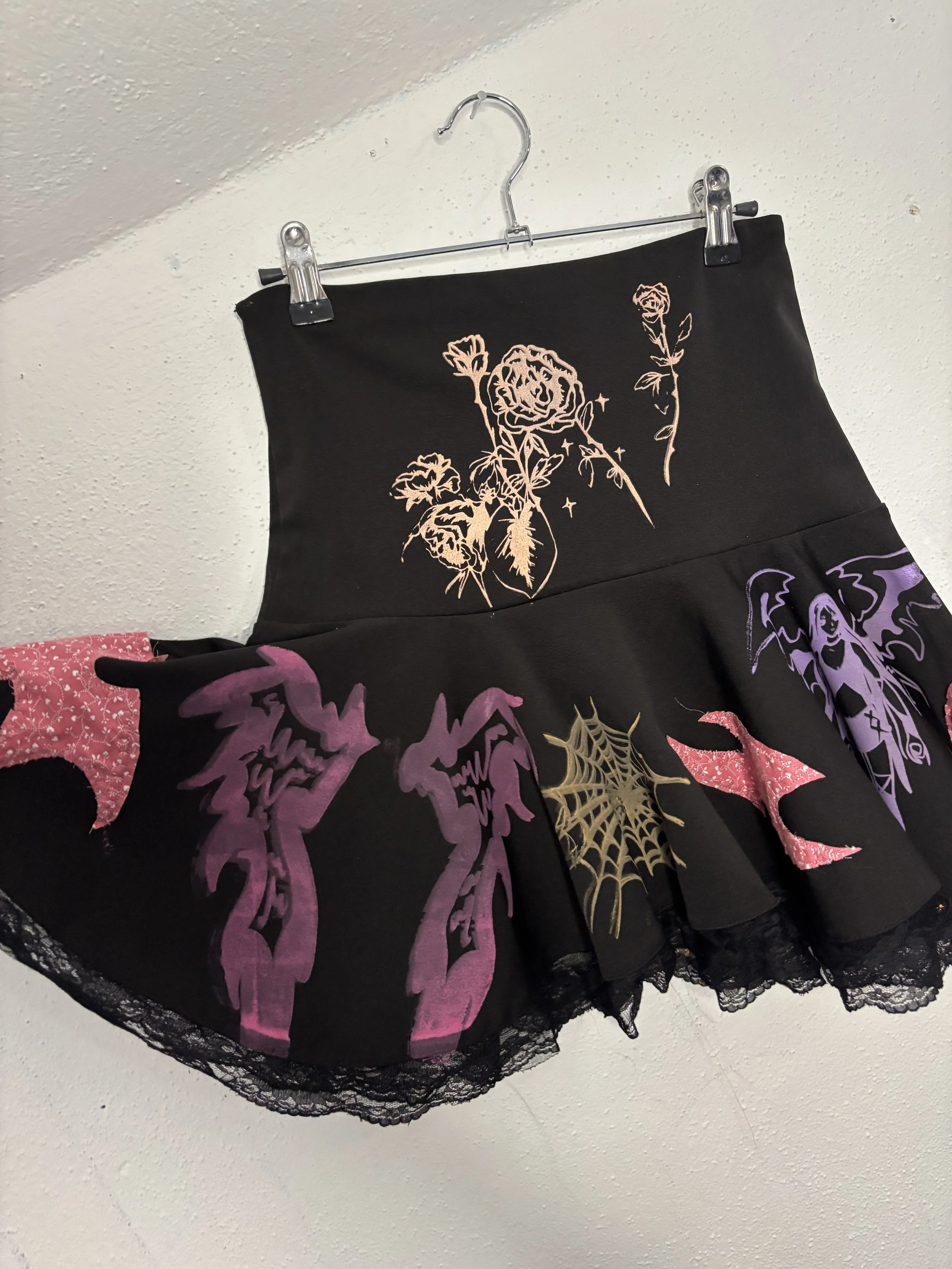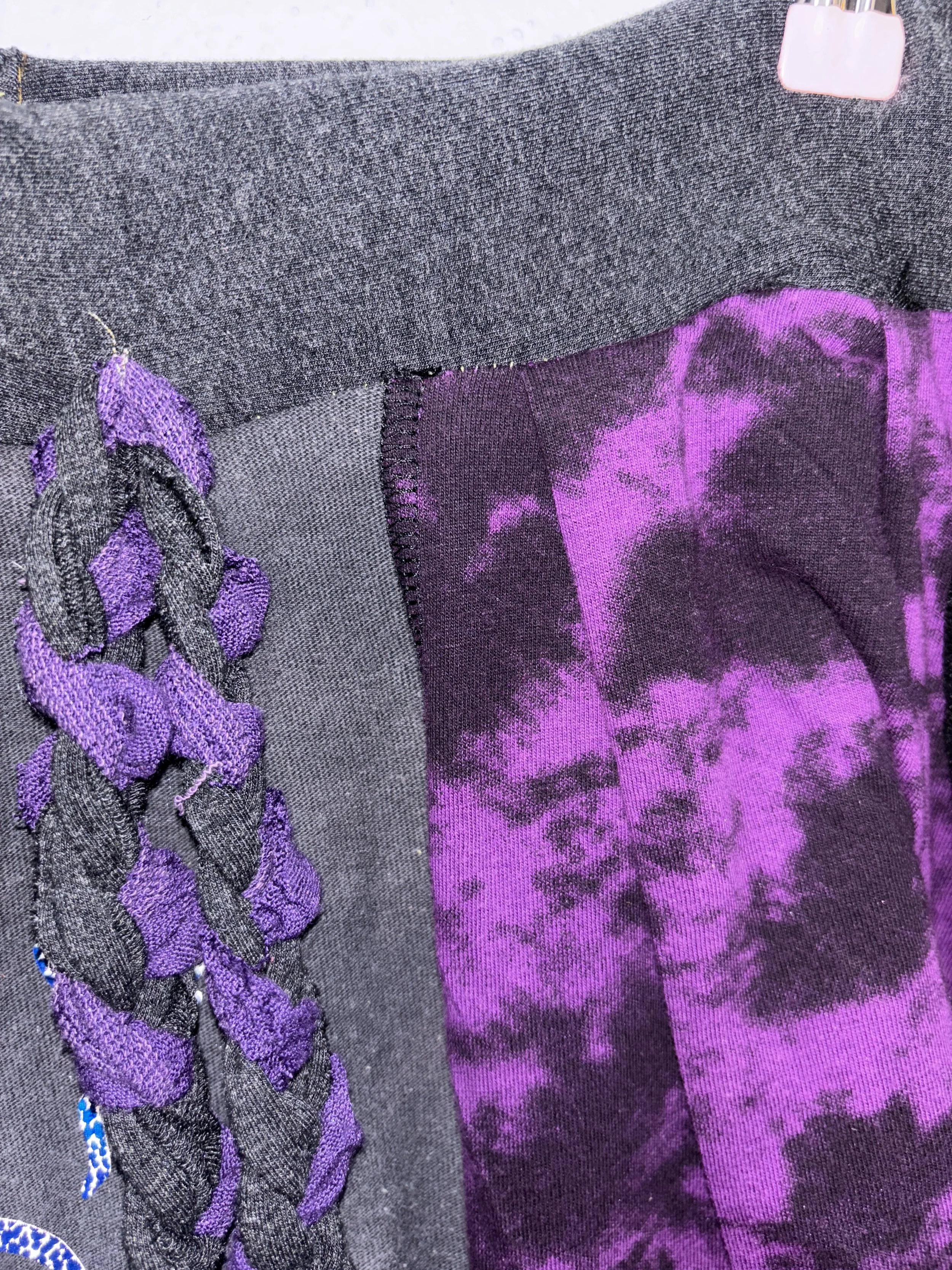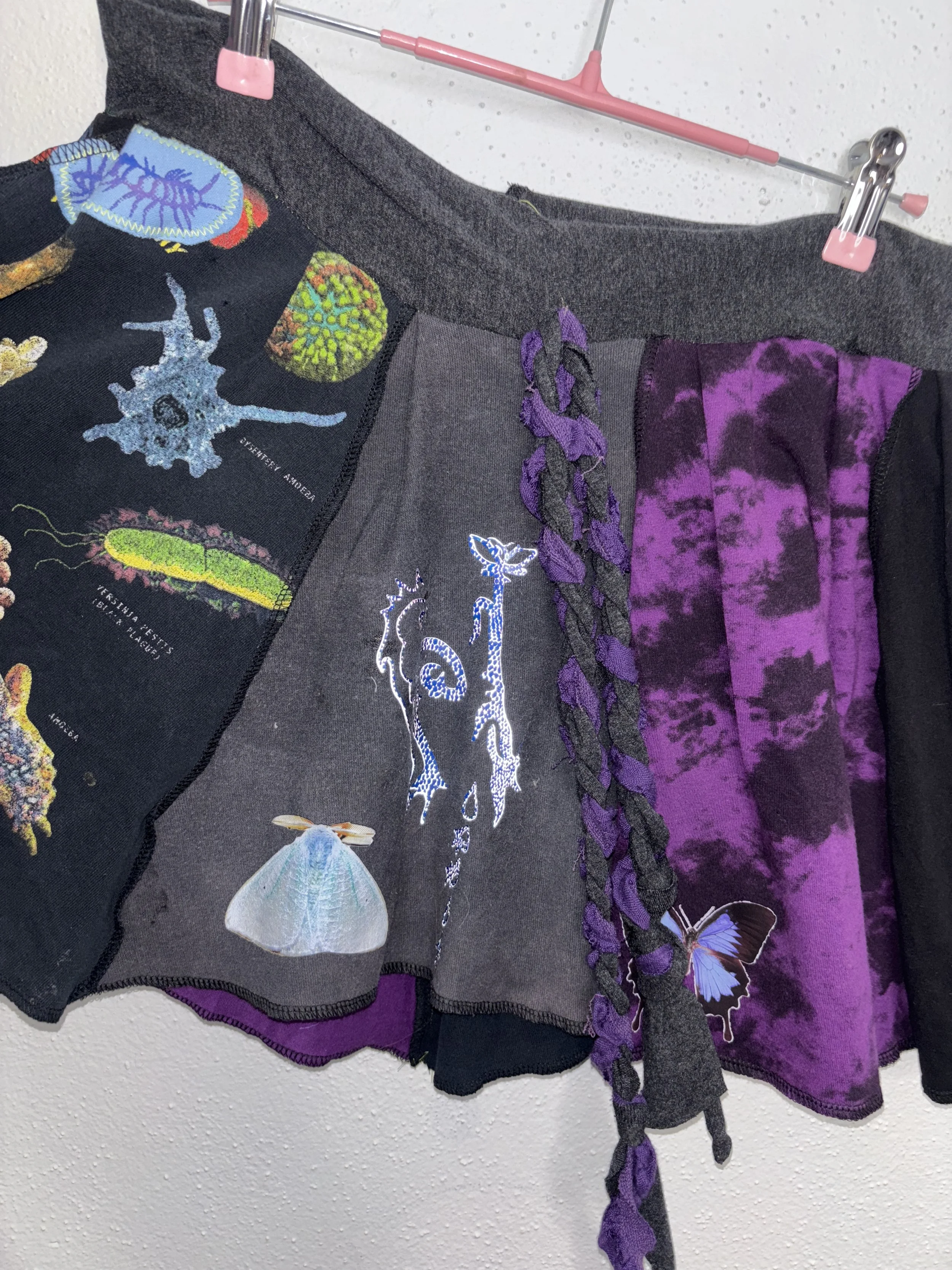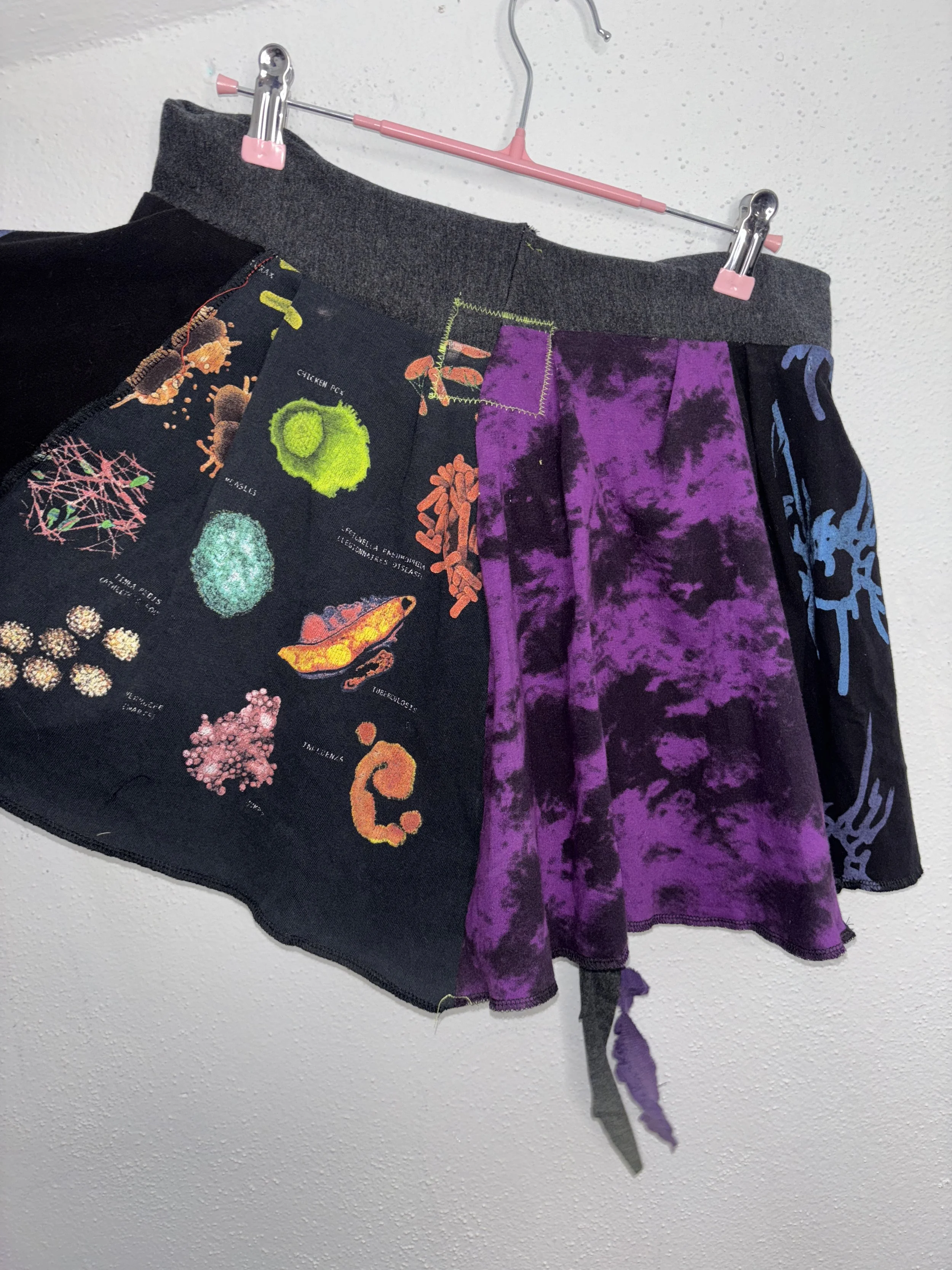 elastic stretch waistband. custom printed stretch jersey cotton/poly blend fabric and handmade 1/1 design. star patch on the back, medium rise, asymmetrical ruffle design.
