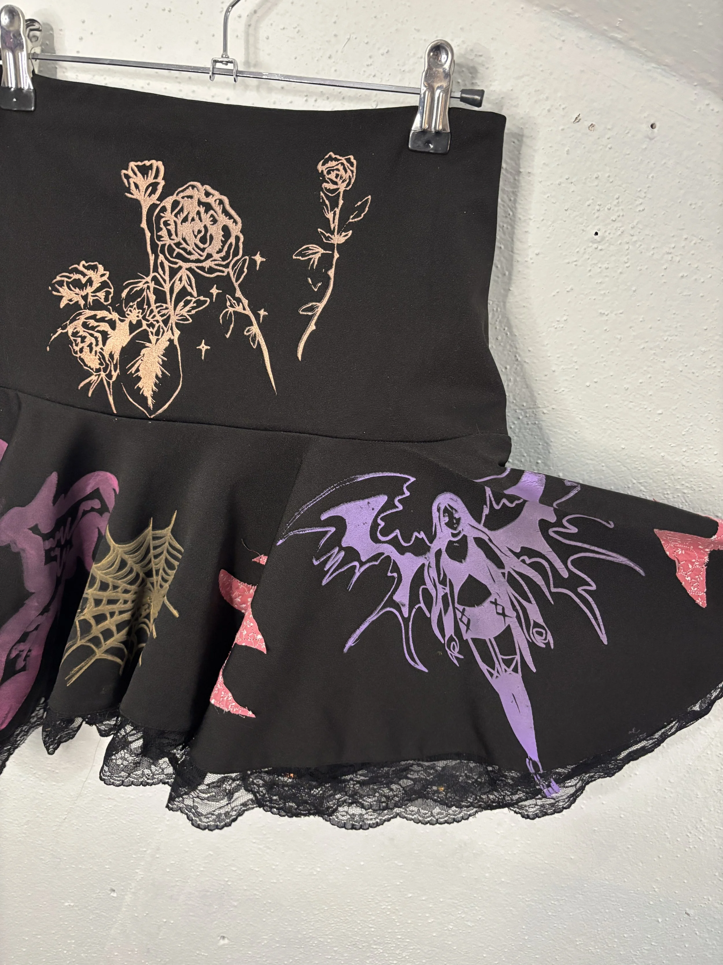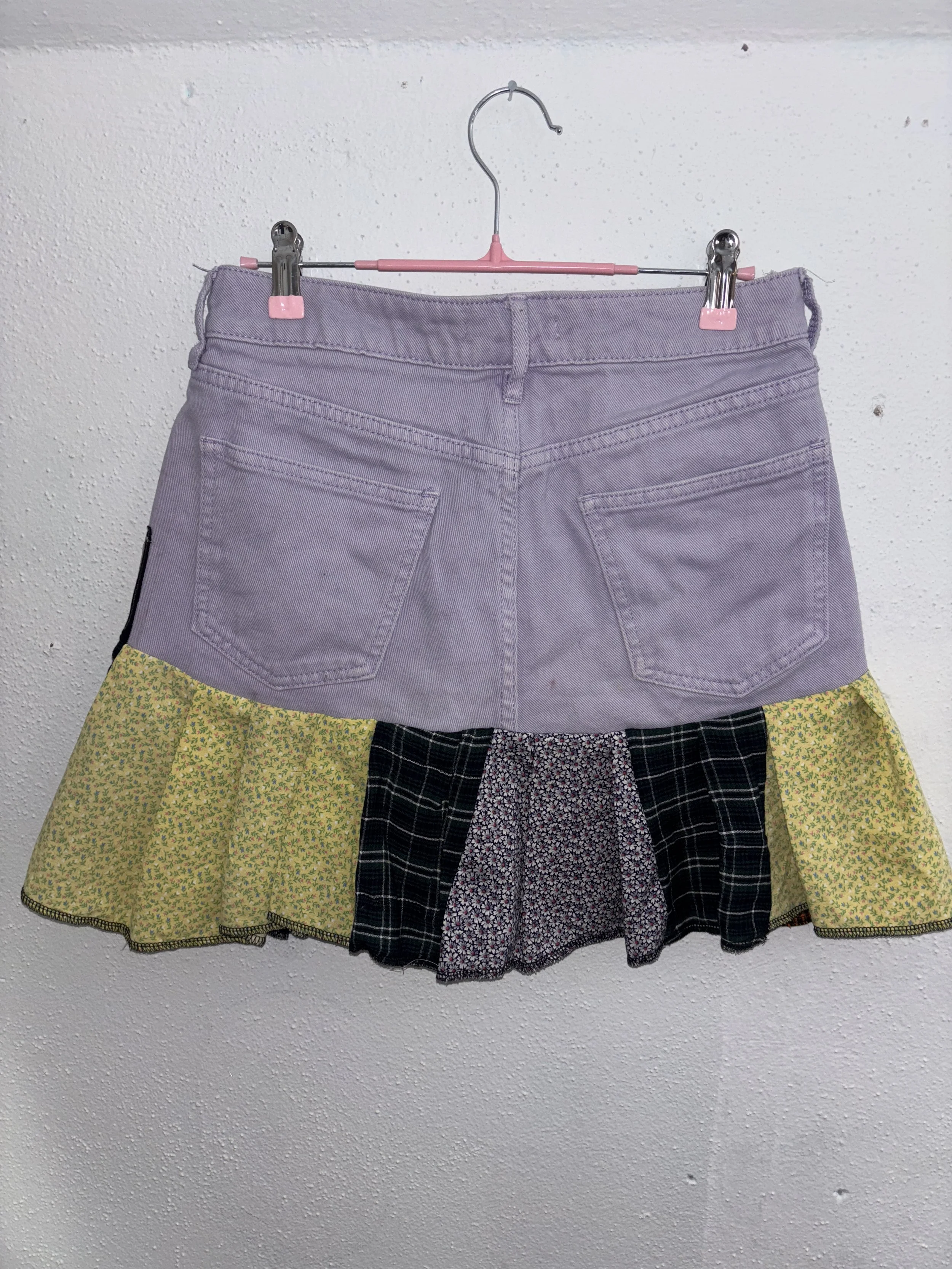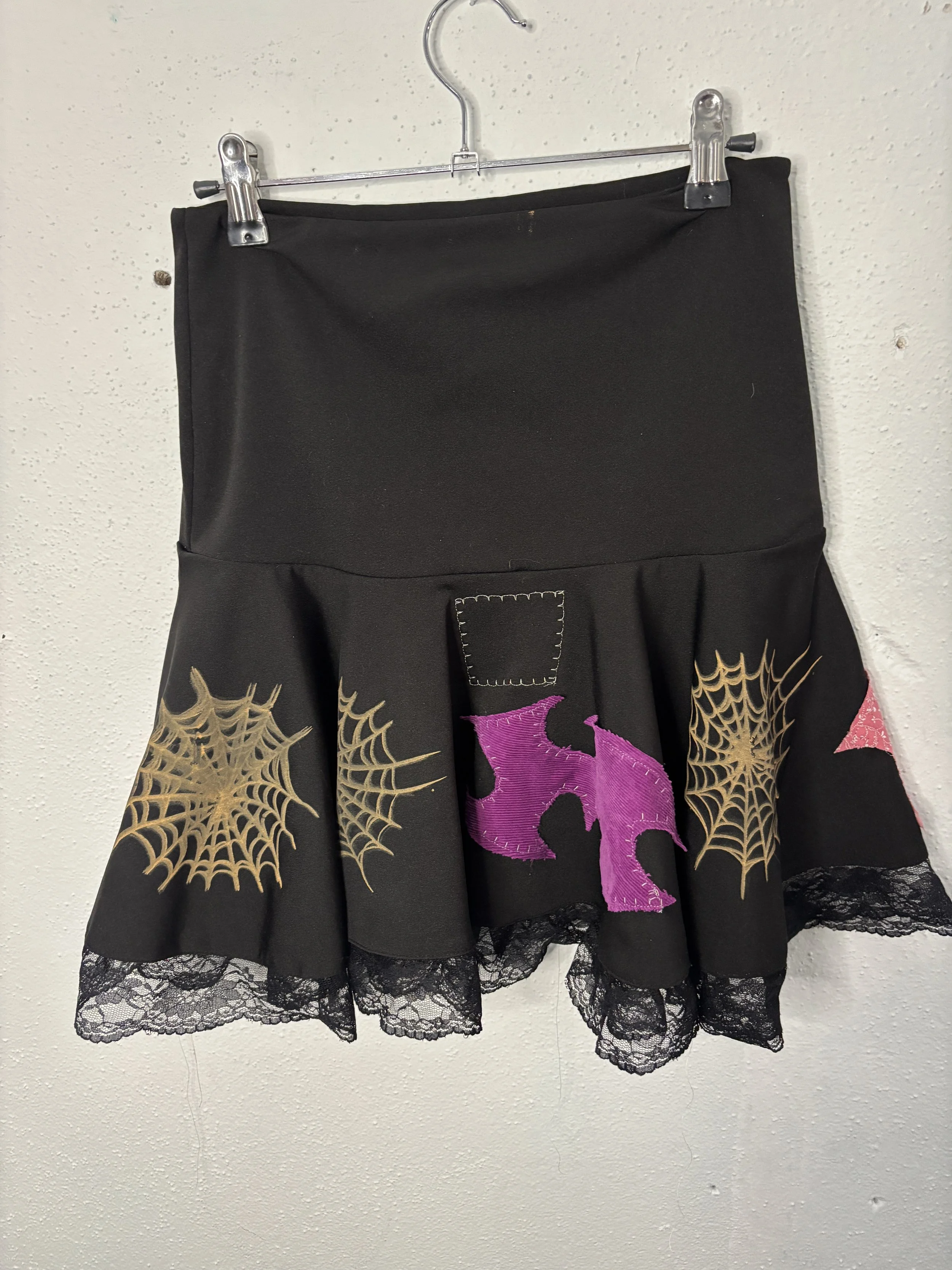 elastic stretch waistband. custom printed stretch jersey cotton/poly blend fabric and handmade 1/1 design. star patch on the back, medium rise, asymmetrical ruffle design.