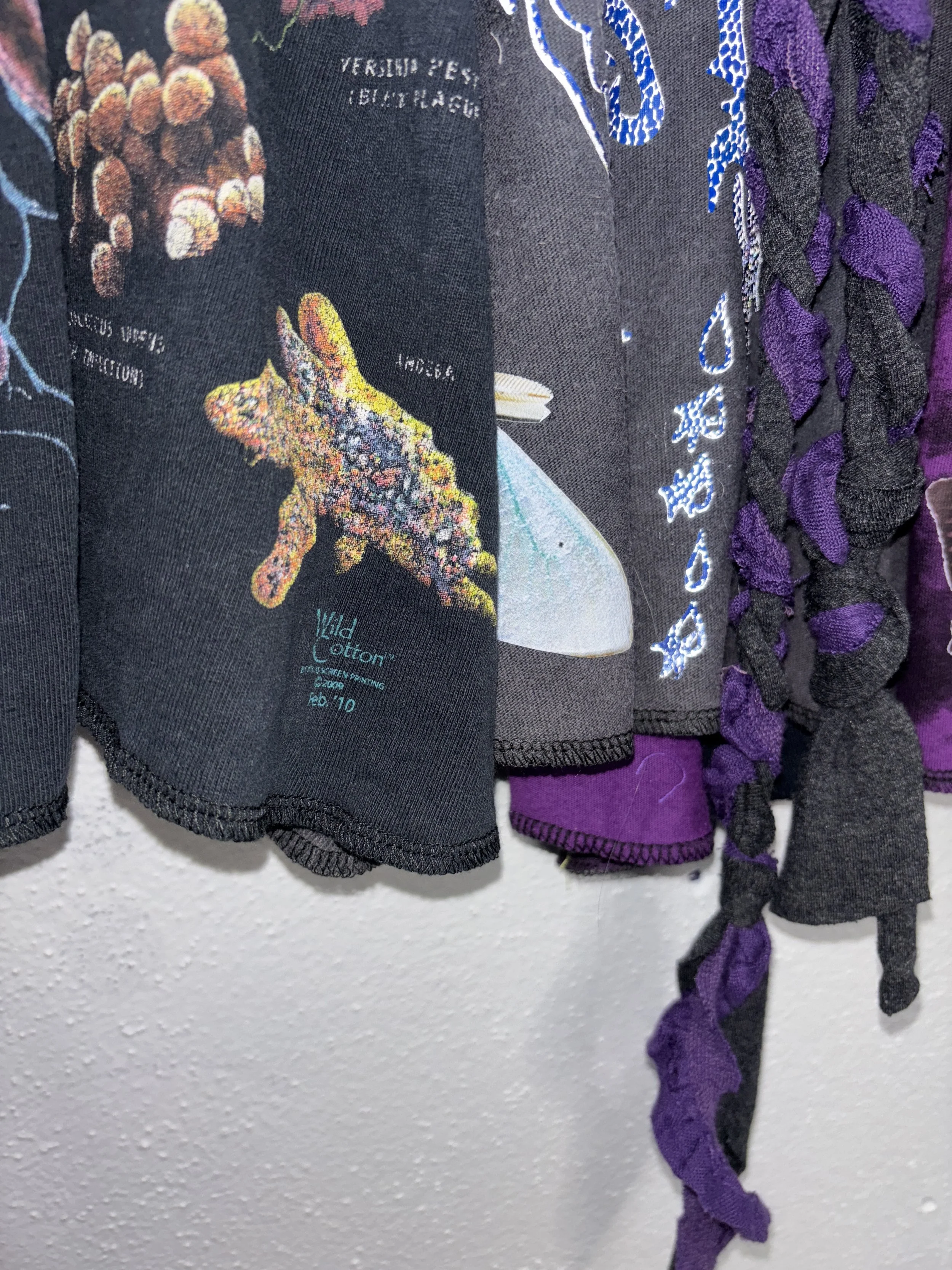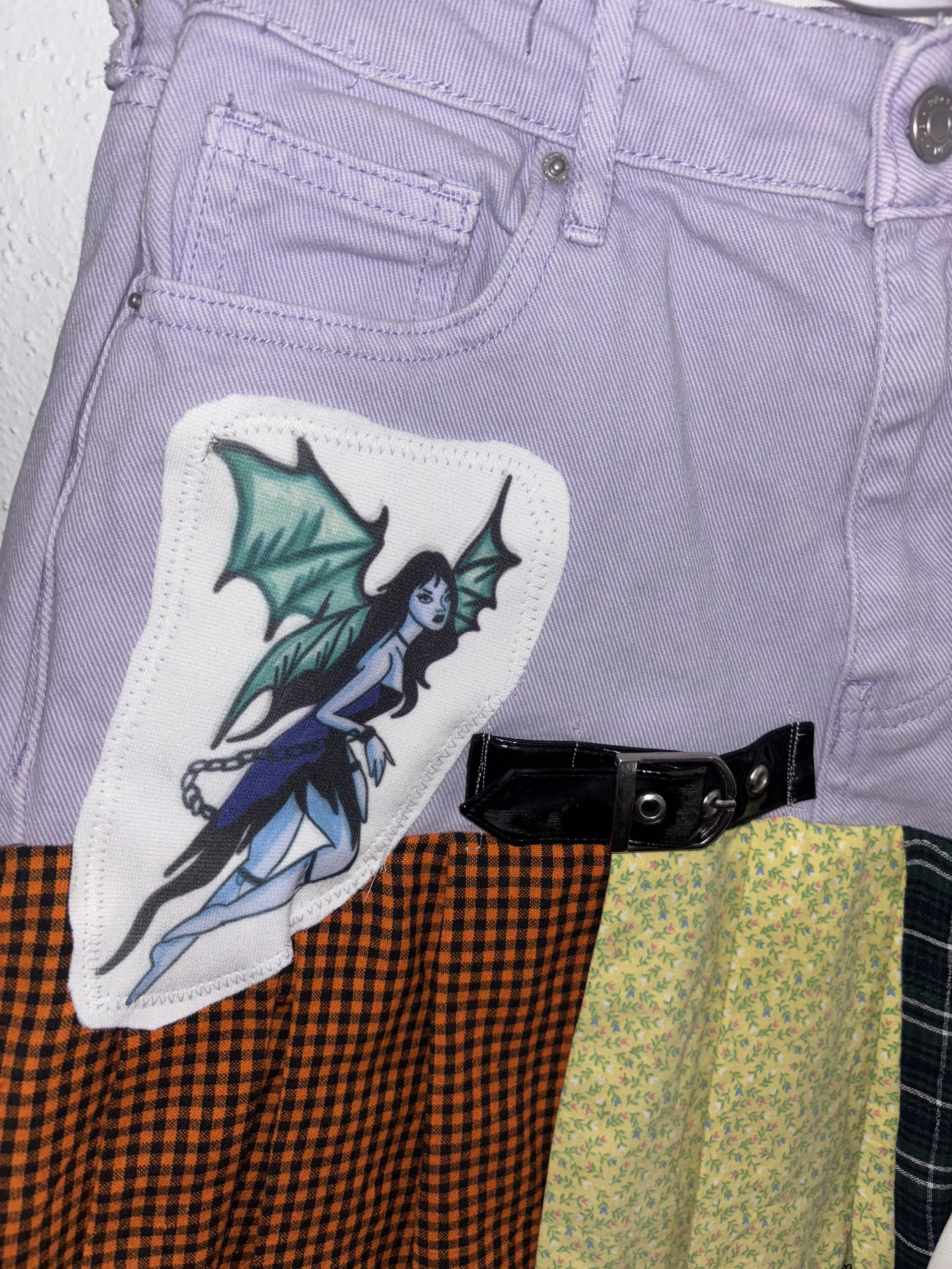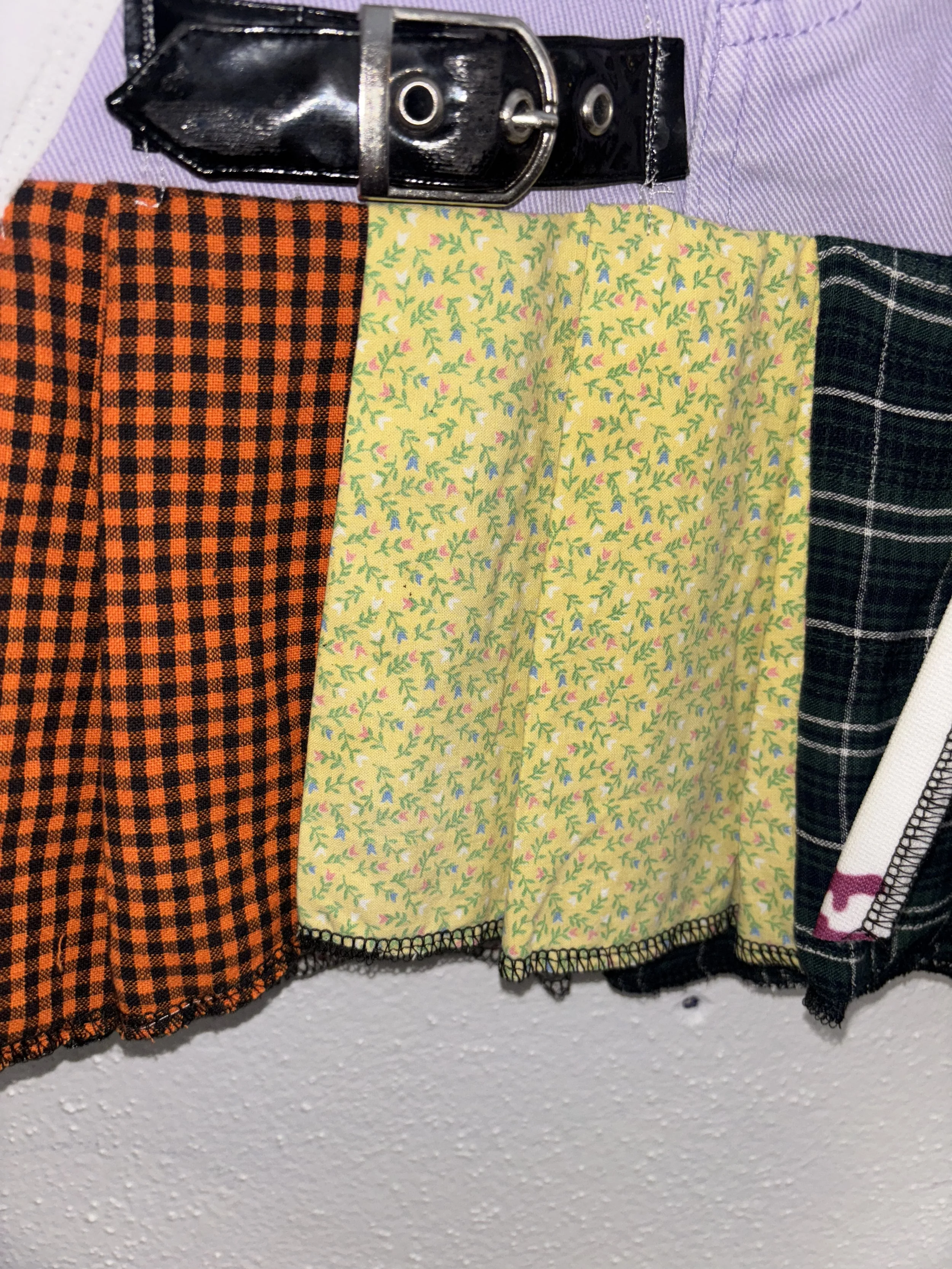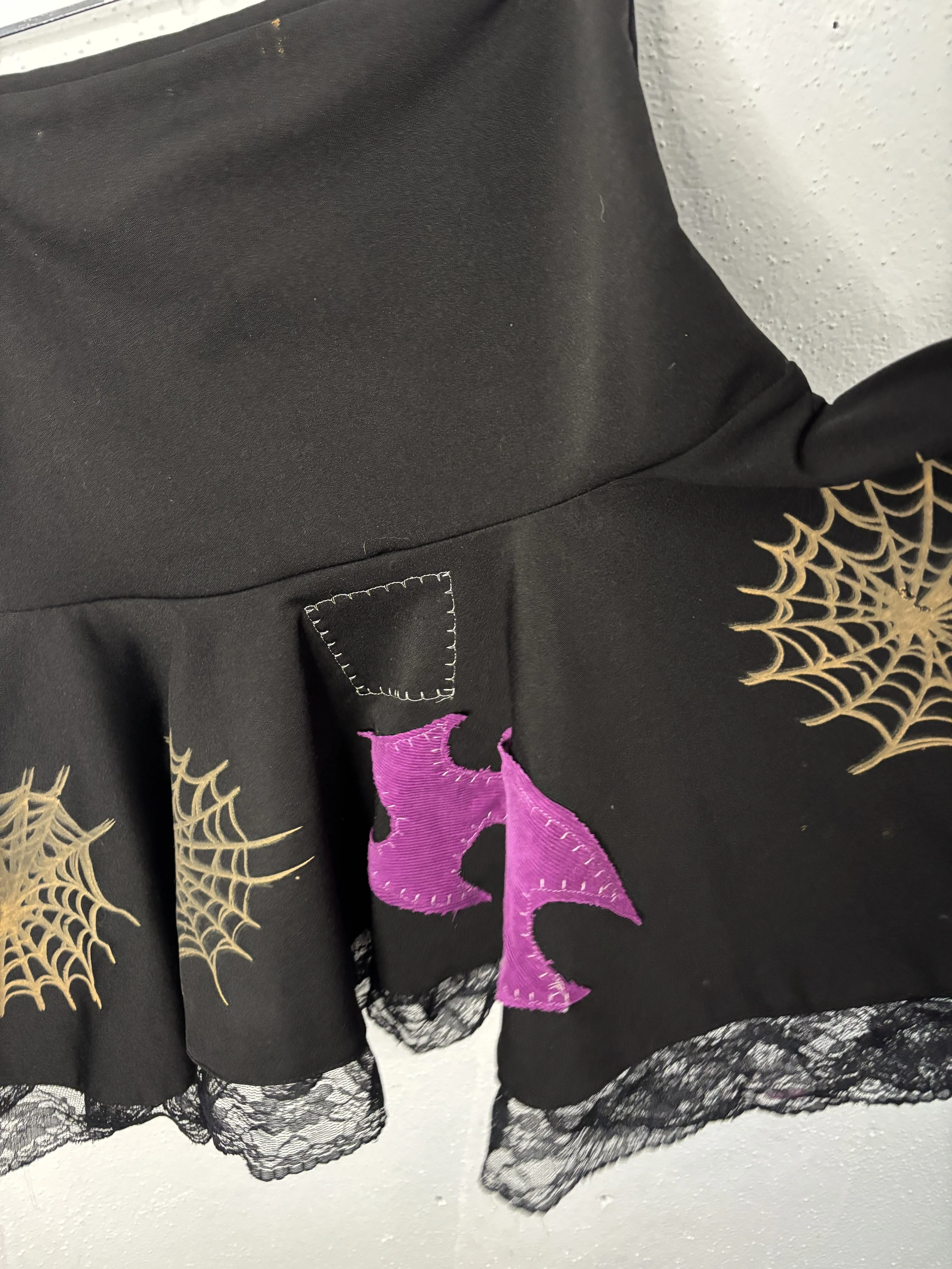 elastic stretch waistband. custom printed stretch jersey cotton/poly blend fabric and handmade 1/1 design. star patch on the back, medium rise, asymmetrical ruffle design.
