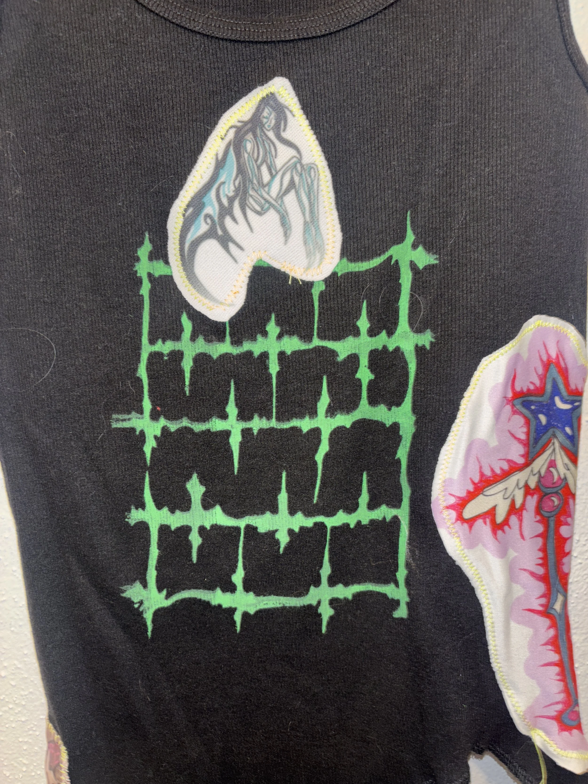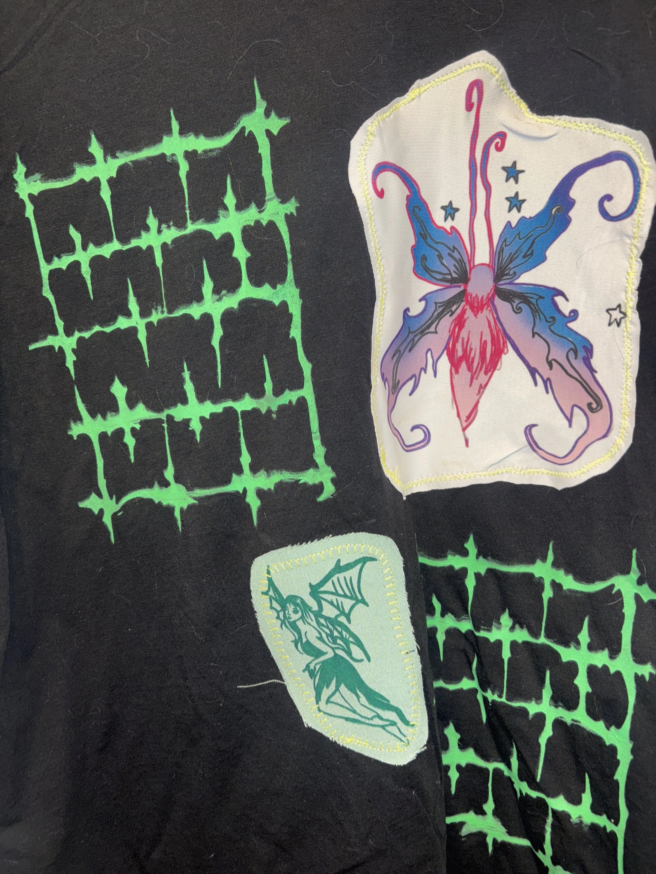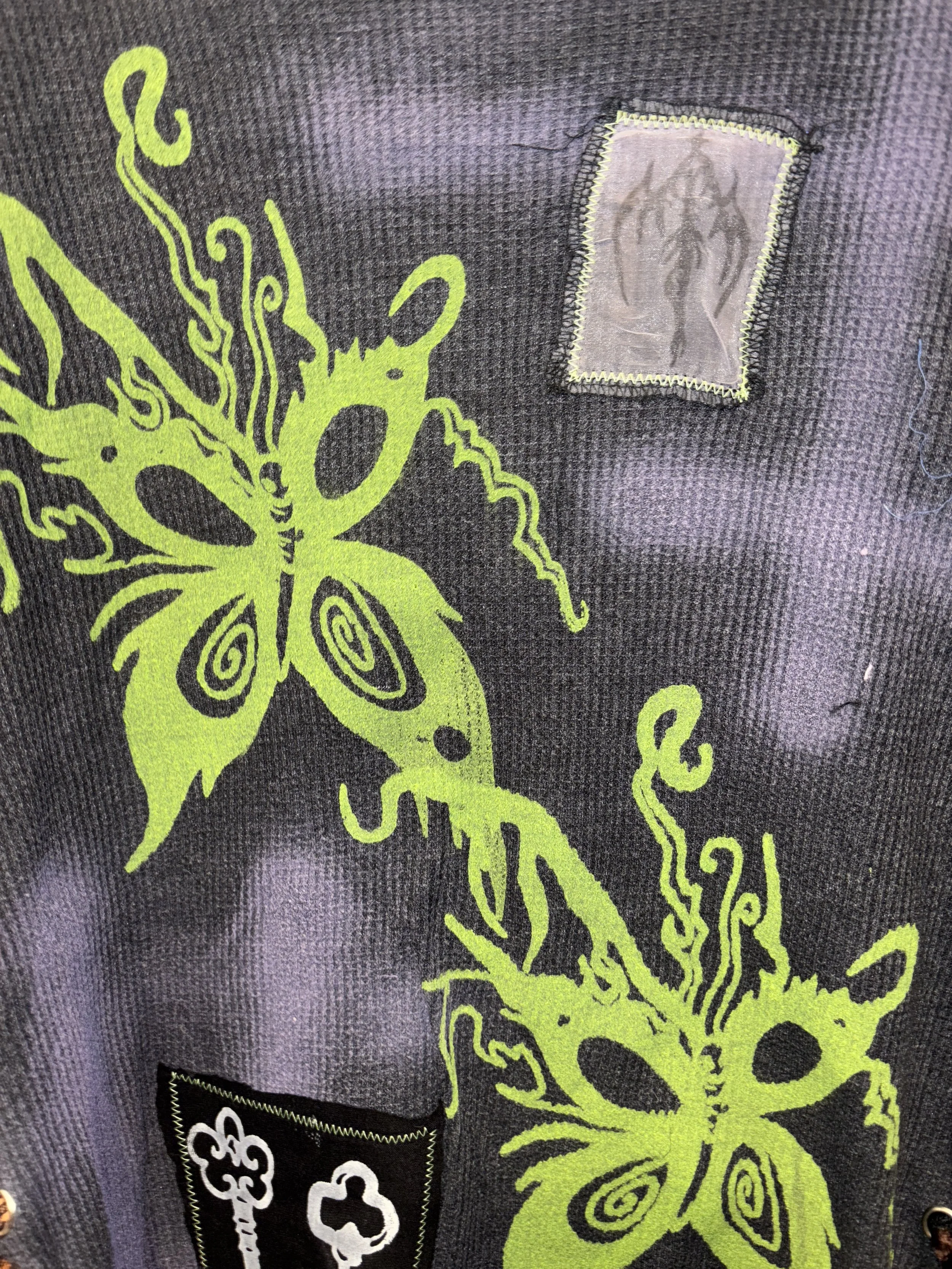 one of a kind, upcycled heavy weight long sleeve with patchwork patches and screen print designs. zippers on side, and ribbed stretch material. it is a longer shirt, originally from ASOS