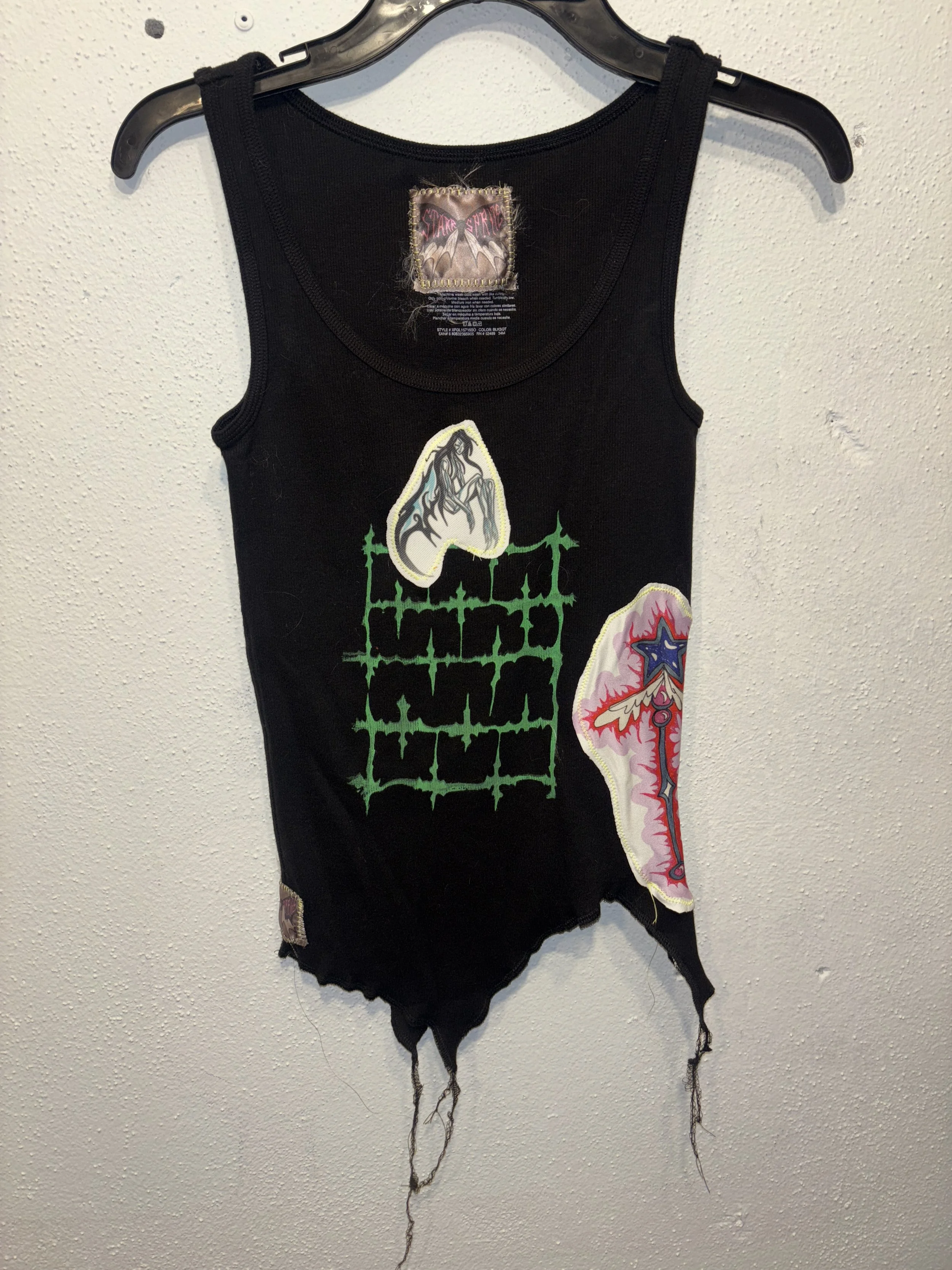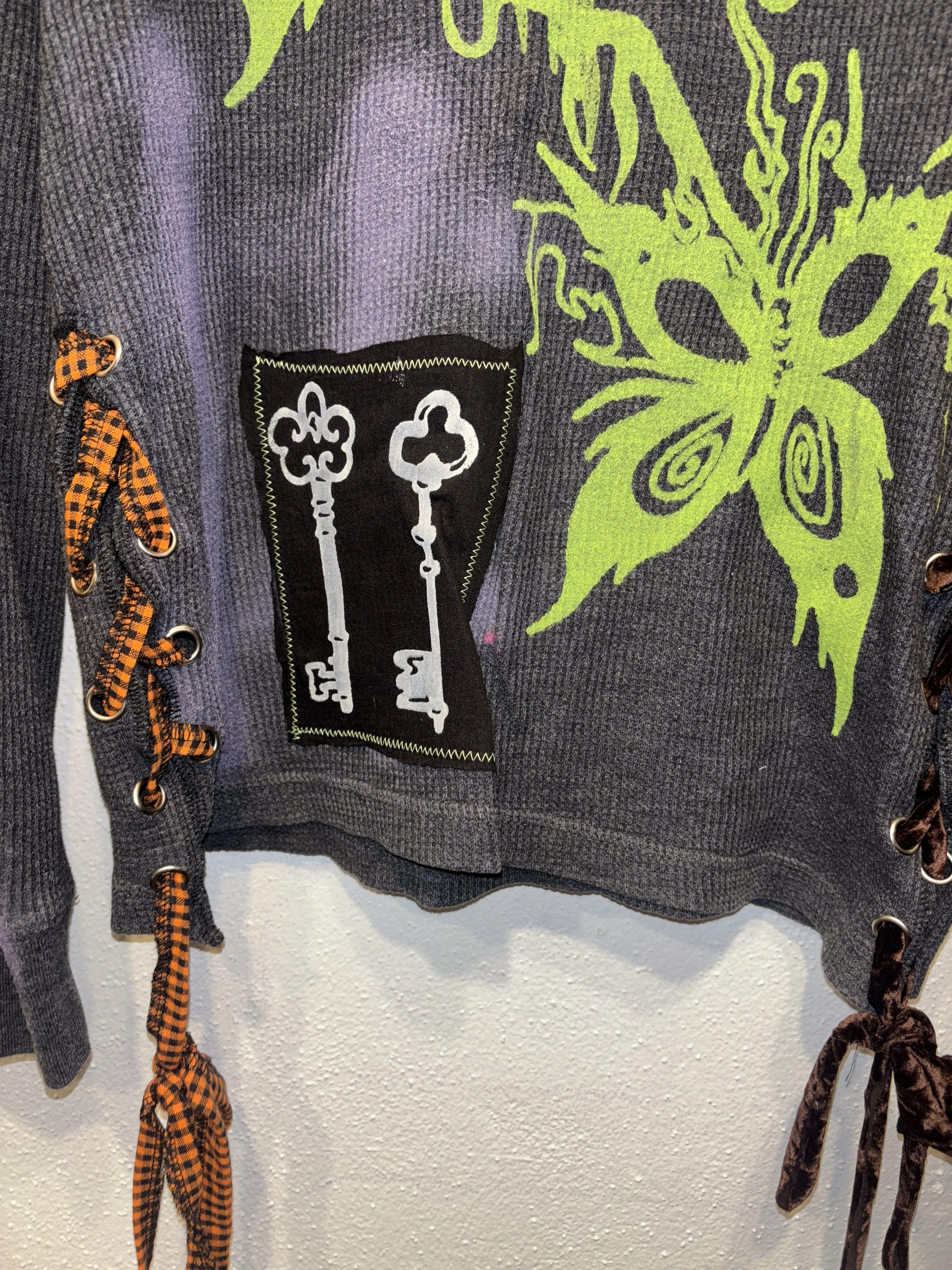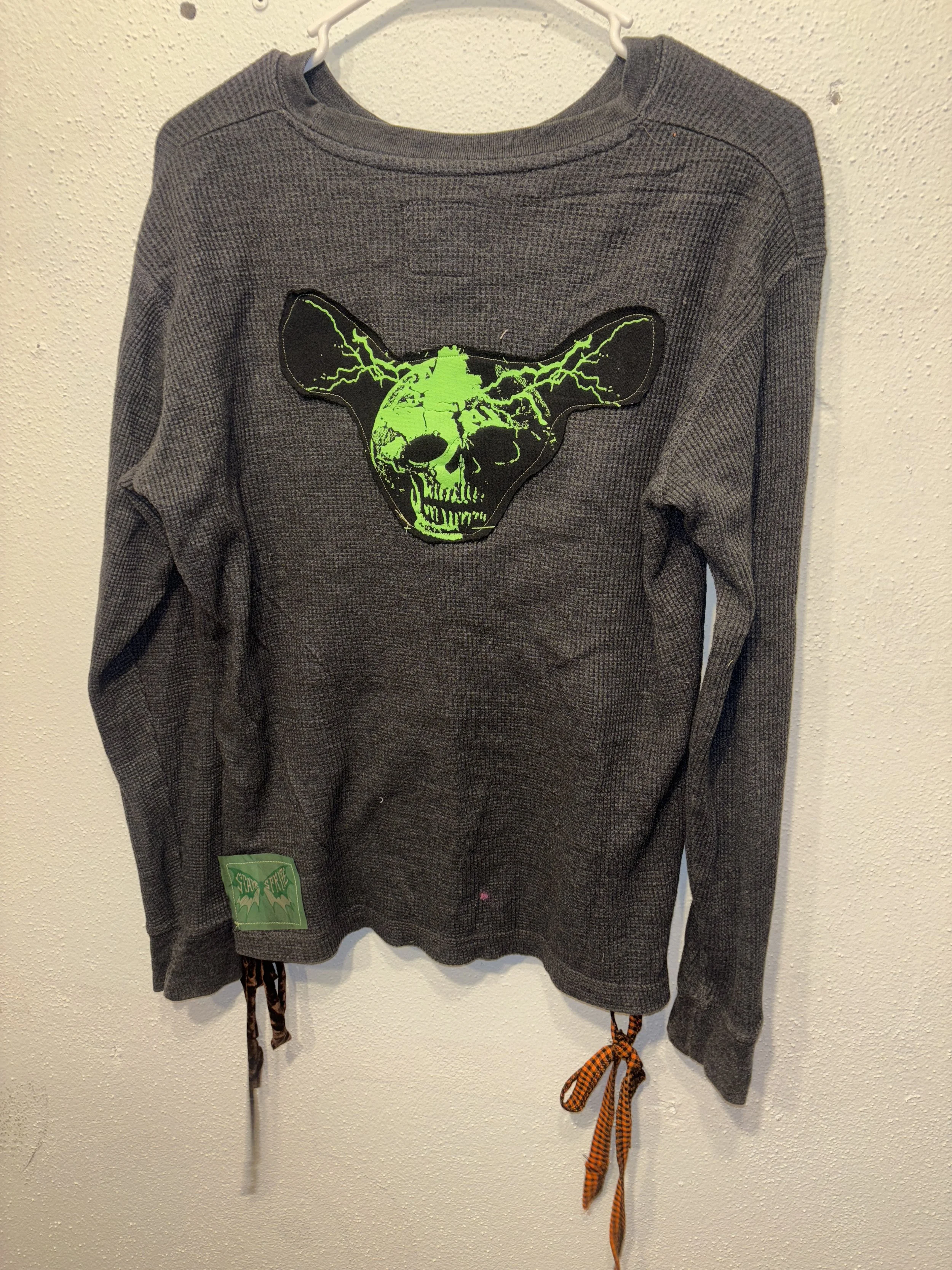 one of a kind, upcycled heavy weight long sleeve with patchwork patches and screen print designs. zippers on side, and ribbed stretch material. it is a longer shirt, originally from ASOS